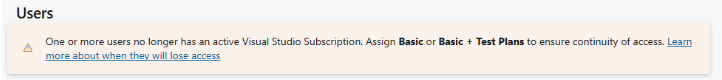 答:如果您的组织中有受影响的用户,Azure DevOps 会在 组织设置>用户中显示一个横幅。 具有过期订阅的用户标识为无效的访问级别,但在 2 月和 3 月继续具有完全访问权限。 使用 访问级别 筛选器仅显示具有无效 Visual Studio 订阅的用户。