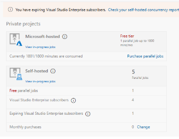 答:如果 Visual Studio Enterprise(VSE)订阅者即将过期,您可以看到将失去多少个免费的 VSE 自托管管道并发性。 检查自承载并发报告,并根据需要考虑增加付费自承载并发。 在 2026 年 4 月之前,即使 Visual Studio Enterprise 订阅者过期,你也不会失去任何自托管并发。