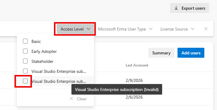 组织设置>用户。选择“访问级别筛选器”并选择无效的订阅类型,例如 Visual Studio Enterprise 订阅(无效)。