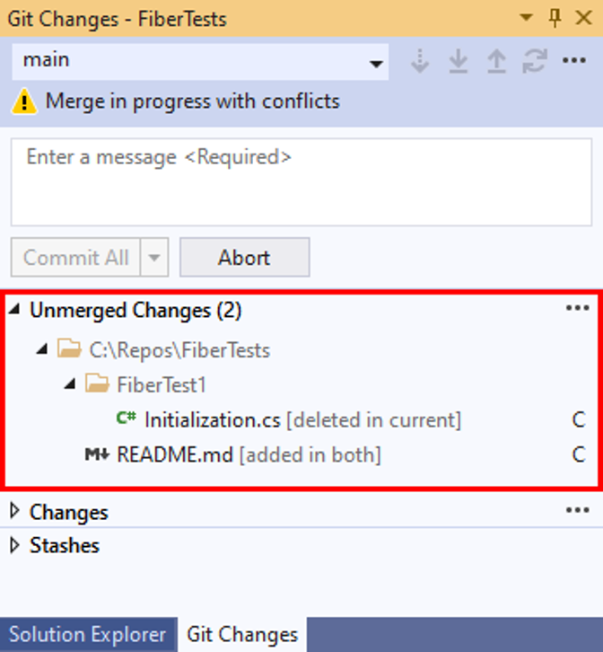 如果 Git 因冲突而停止合并,Visual Studio 将通知你。 在这种情况下,可以解决冲突,也可以取消合并并返回到合并前状态。 “Git 更改”窗口的“未合并更改”部分列出了合并冲突的文件。 对于内容中存在合并冲突的文件,请双击该文件以在合并编辑器中打开它。