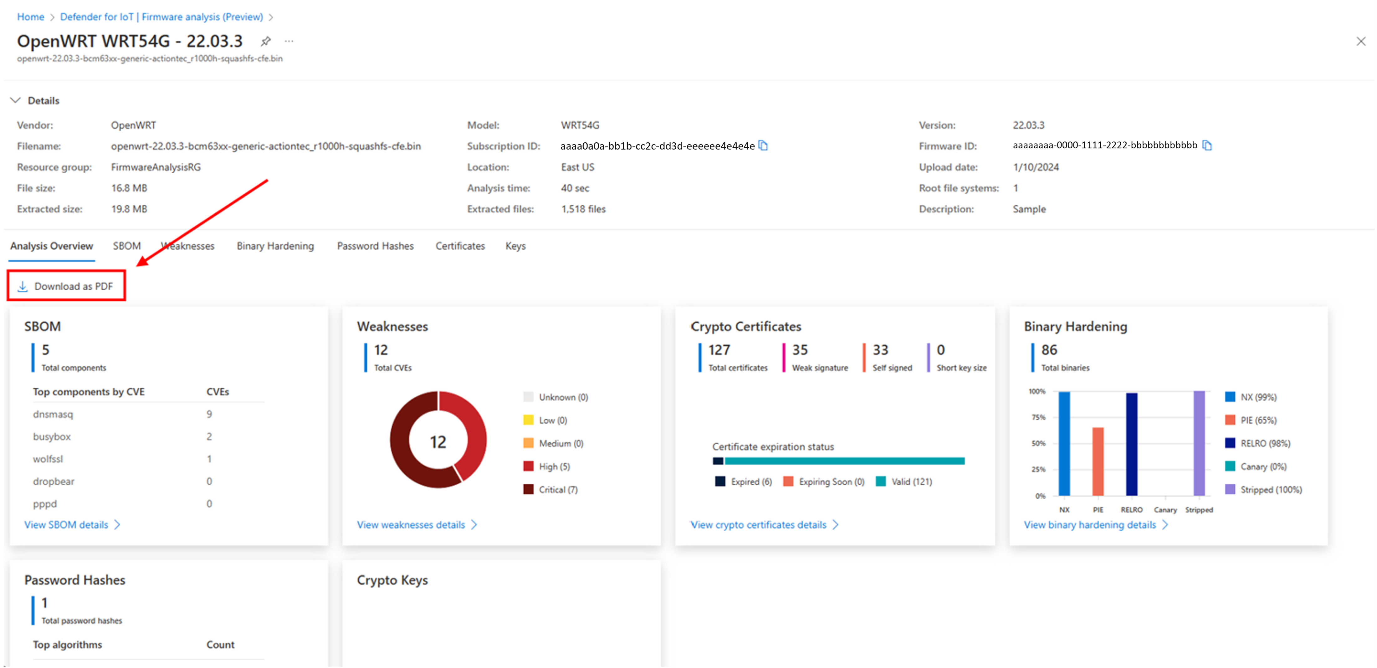 PDF 报表生成器:在“概述”页面上添加了“以 PDF 格式下载”功能,用于生成并下载固件分析结果的 PDF 报表。