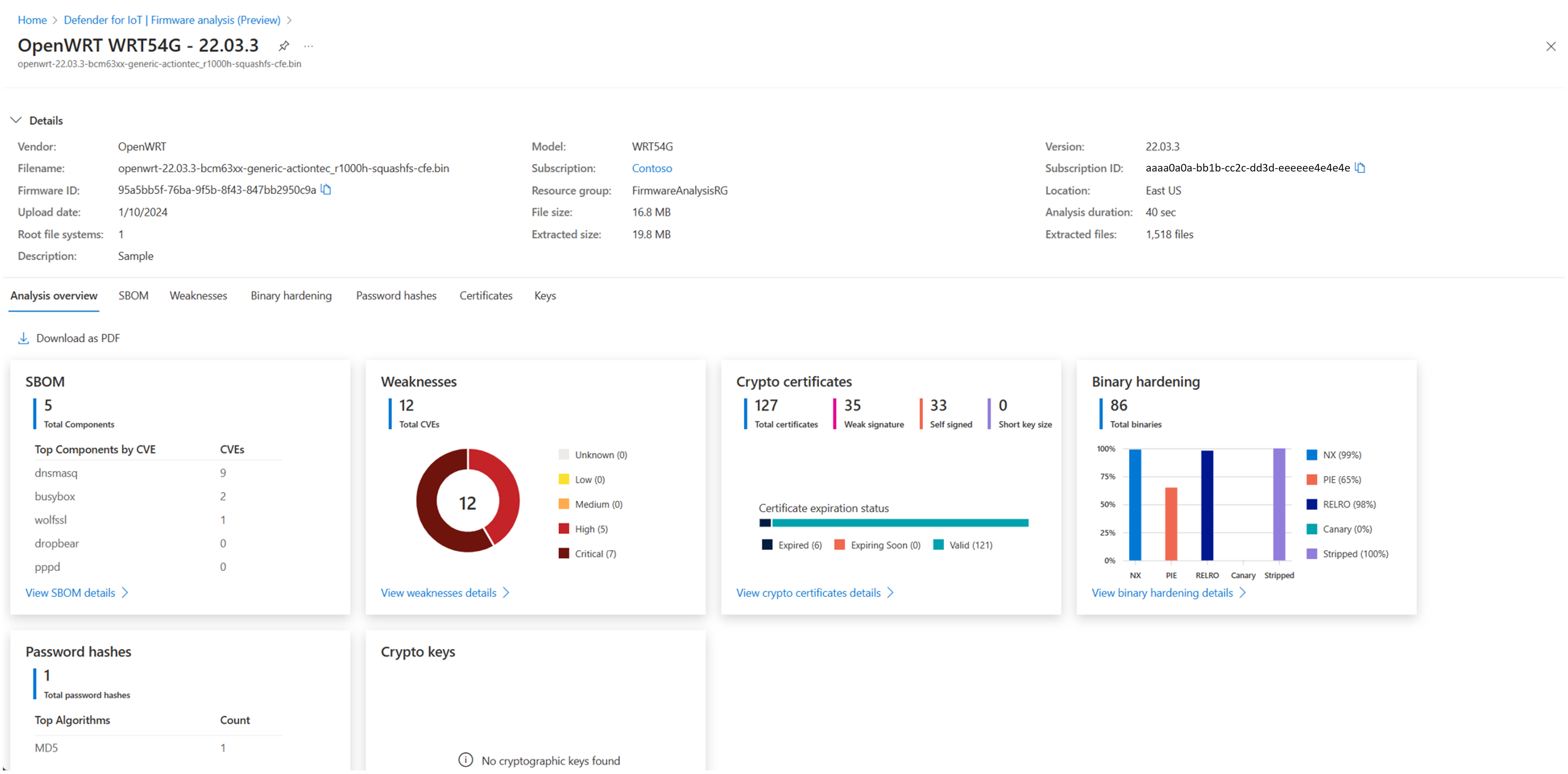 微软 Defender for IoT 固件分析现在以公共预览版提供。 Defender for IoT 可以分析设备固件是否存在常见的弱点和漏洞,并提供对固件安全性的见解。 无论是在内部构建固件还是从供应商接收固件,此分析都很有用。
