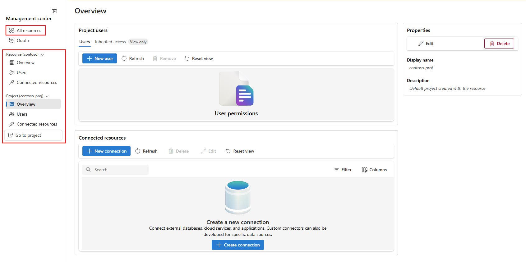使用管理中心创建和配置 Foundry 项目。 使用 “所有资源 ”查看你有权访问的所有 Foundry 项目,或创建新项目。 使用左侧菜单的 Project 部分(Project = Foundry 项目)在 Foundry 资源上管理和创建单个 Foundry 项目。