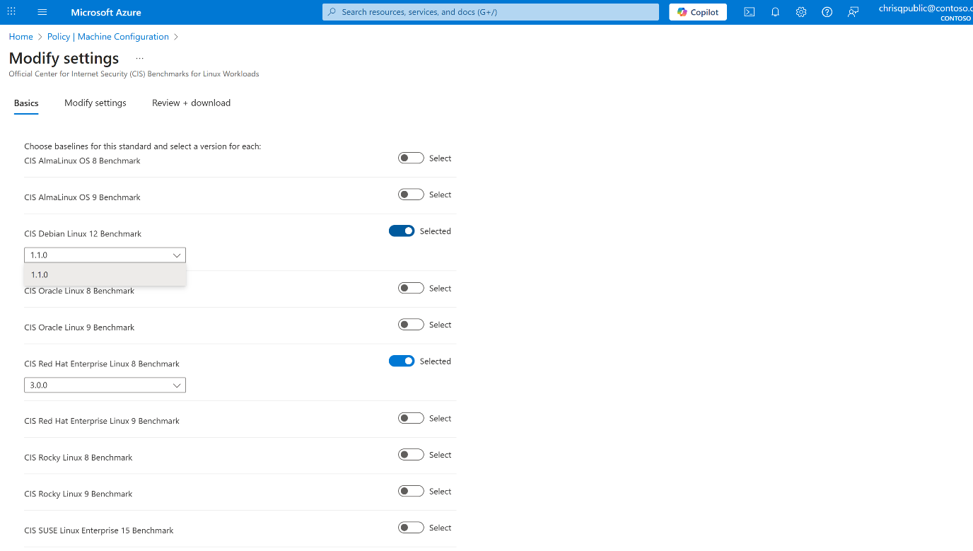 对于 Azure 基线(Windows 或 Linux): 这些基线在操作系统之间一致应用,无需选择发行版。 在 “基本信息 ”下确认基线版本并继续。