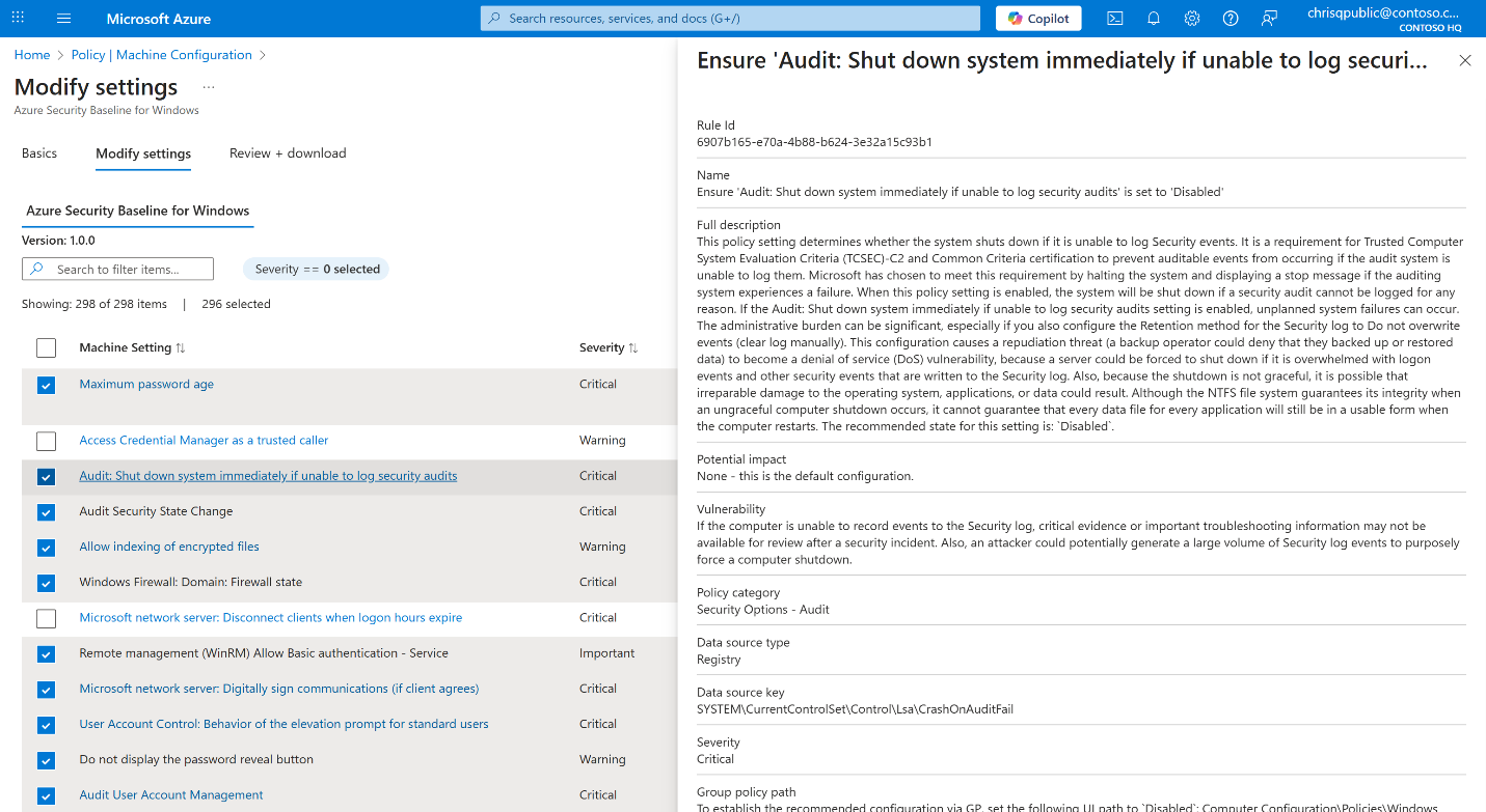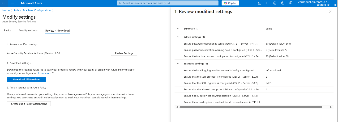 新的 Azure Policy 设置选取器体验简化了此过程。 它允许你选择要评估和调整配置参数以进行精细控制的设置。 该体验支持适用于 Linux 和 Windows 的高级输入格式,并将自定义基线导出为可重用 JSON 项目。 这种灵活性可确保无论工作负荷在何处运行,策略强制实施都是一致的、精确且适应复杂的企业需求。
