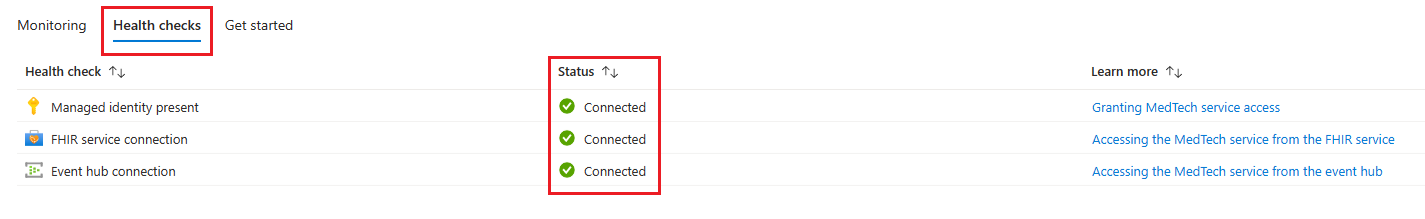 选择医疗技术服务中的“运行状况检查”选项卡来显示运行状况检查。 在本例中,医疗技术服务已通过所有运行状况检查,如“状态”行和“已连接”状态所示。