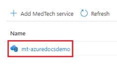 选择要显示指标的医疗技术服务。 在本例中,我们将选择名为“mt-azuredocsdemo”的医疗技术服务。 你将在自己的 Azure Health Data Services 工作区内选择一项医疗技术服务。