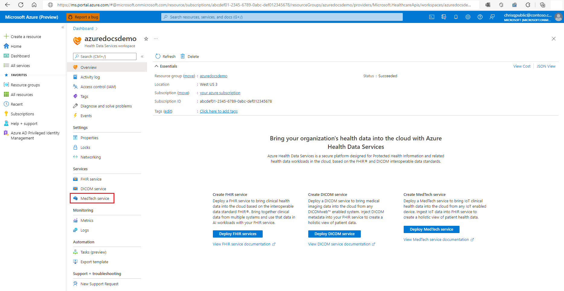 在 Azure Health Data Services 工作区中的“服务”下选择“医疗技术服务”。