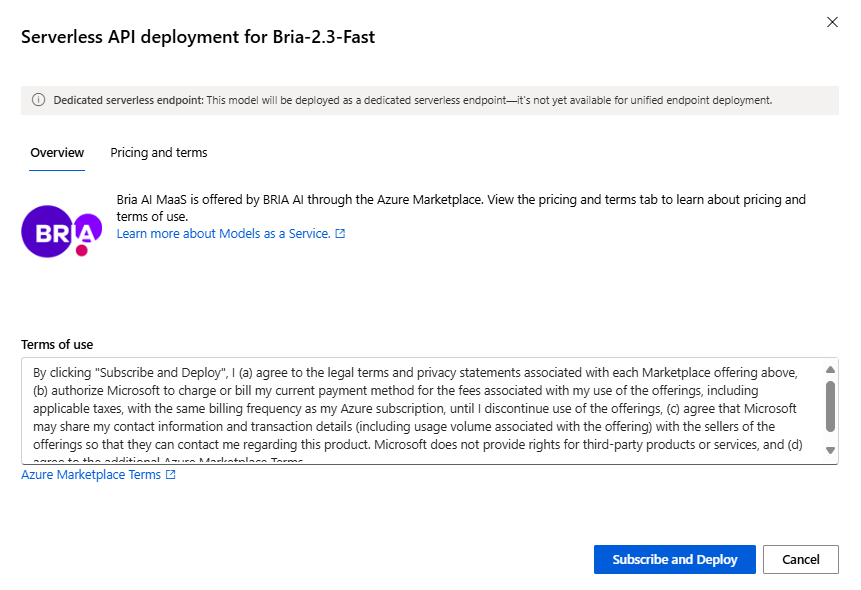 在部署向导中,选择“Azure 市场条款”的链接,了解有关使用条款的详细信息。 还可以选择“市场产品/服务详细信息”选项卡,了解所选模型的定价。