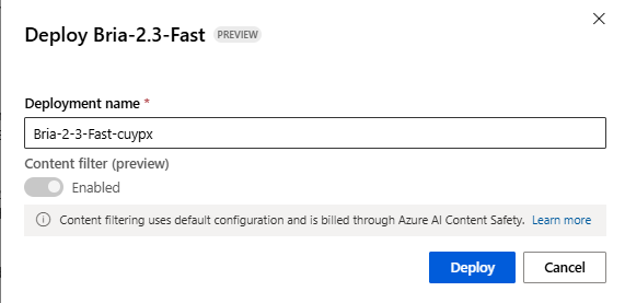 默认情况下,“内容筛选器(预览)”选项处于启用状态。 请保留该服务的默认设置,以检测有害内容,例如仇恨、自残、性和暴力内容。 有关内容筛选(预览版)的详细信息,请参阅 通过标准部署部署部署的模型的内容安全。