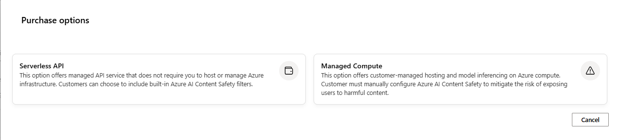 在模型的 “详细信息 ”页上,选择“ 使用此模型”。 此时会打开 “部署选项” 窗口,提供使用托管计算在标准部署(无服务器 API)和部署之间进行选择。