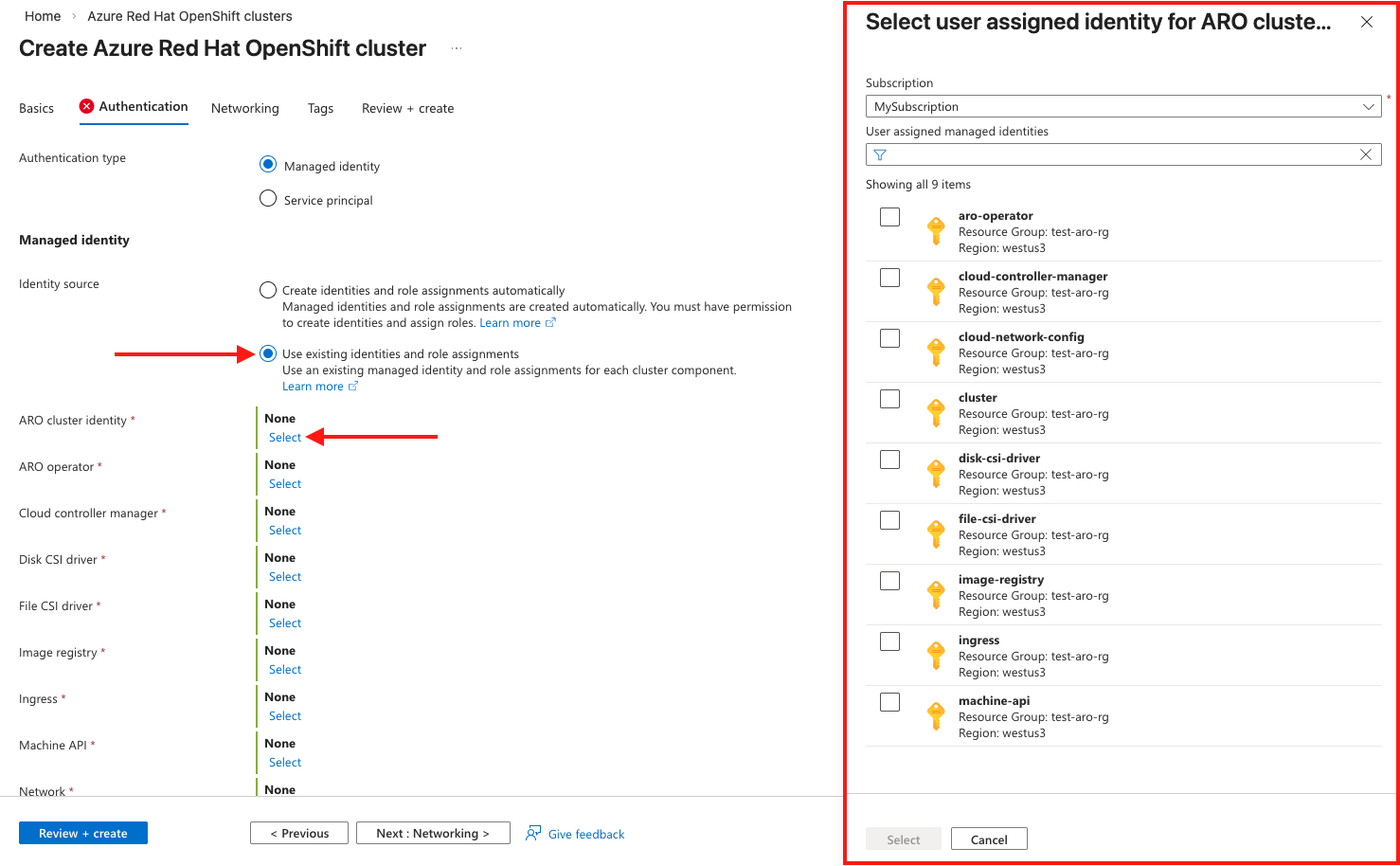 如果使用现有的托管标识,则必须具有现有的虚拟网络和子网。 作为群集创建流的一部分,将无法创建新的虚拟网络。