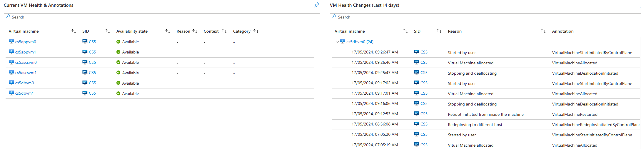 它还显示 VM 的当前可用性状态以及不可用的相应原因。 此视觉对象后跟在 VIS 的任何 VM 中过去 14 天内发生的关键运行状况事件列表。