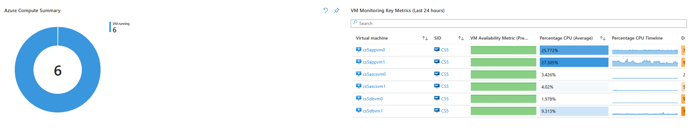 此视觉对象后跟虚拟机级别的关键监视指标,其中显示了 VM 可用性、CPU、磁盘和网络使用情况等关键指标的 24 小时趋势。