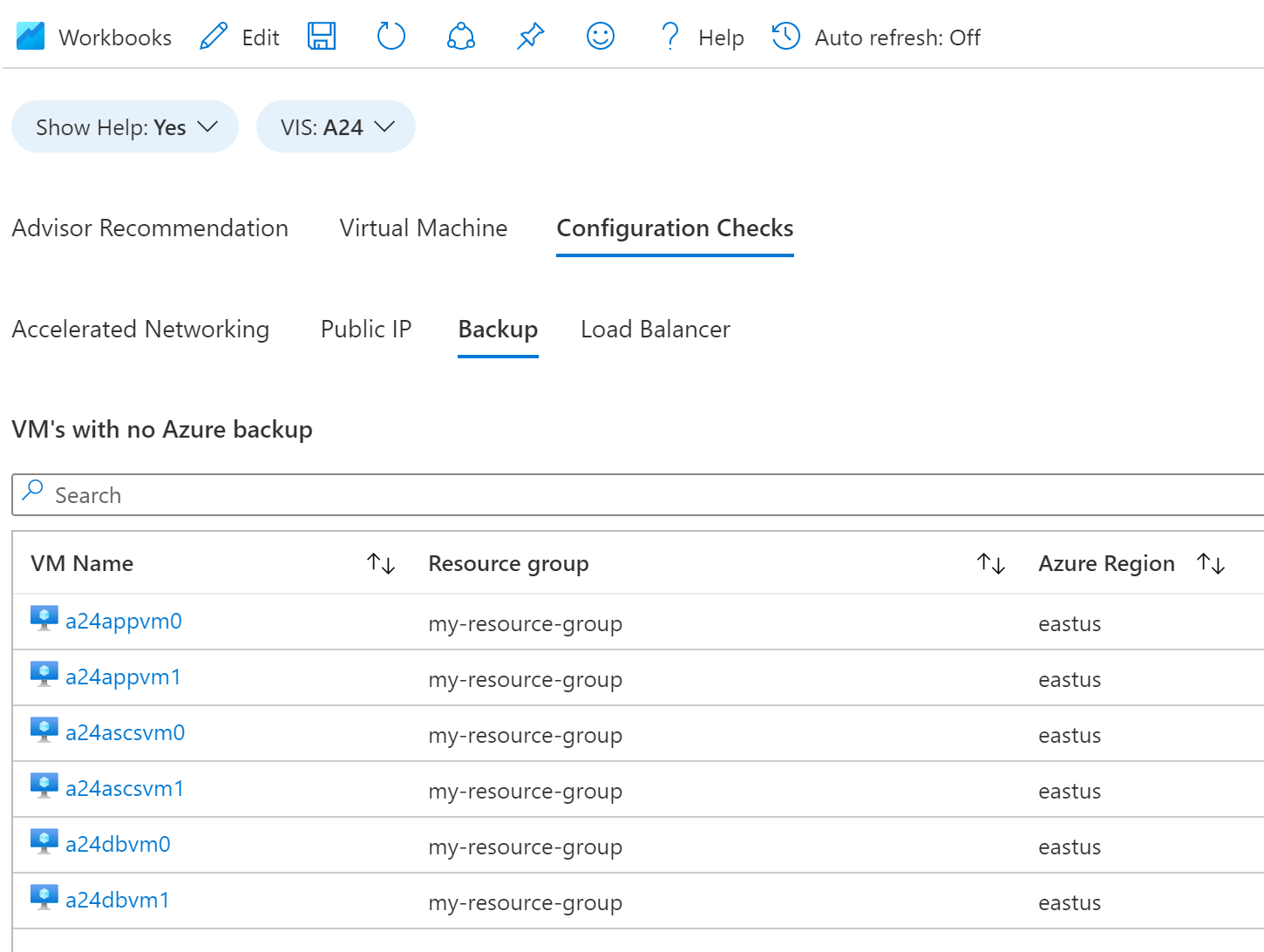 “备份”选项卡显示未配置 Azure 备份的 VM 表。 建议对 VM 使用 Azure 备份。
