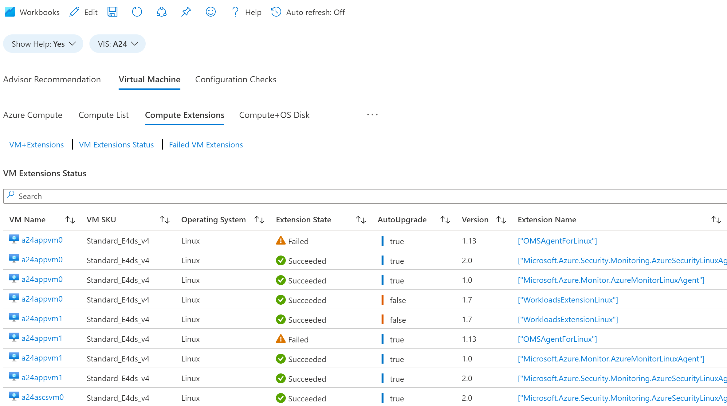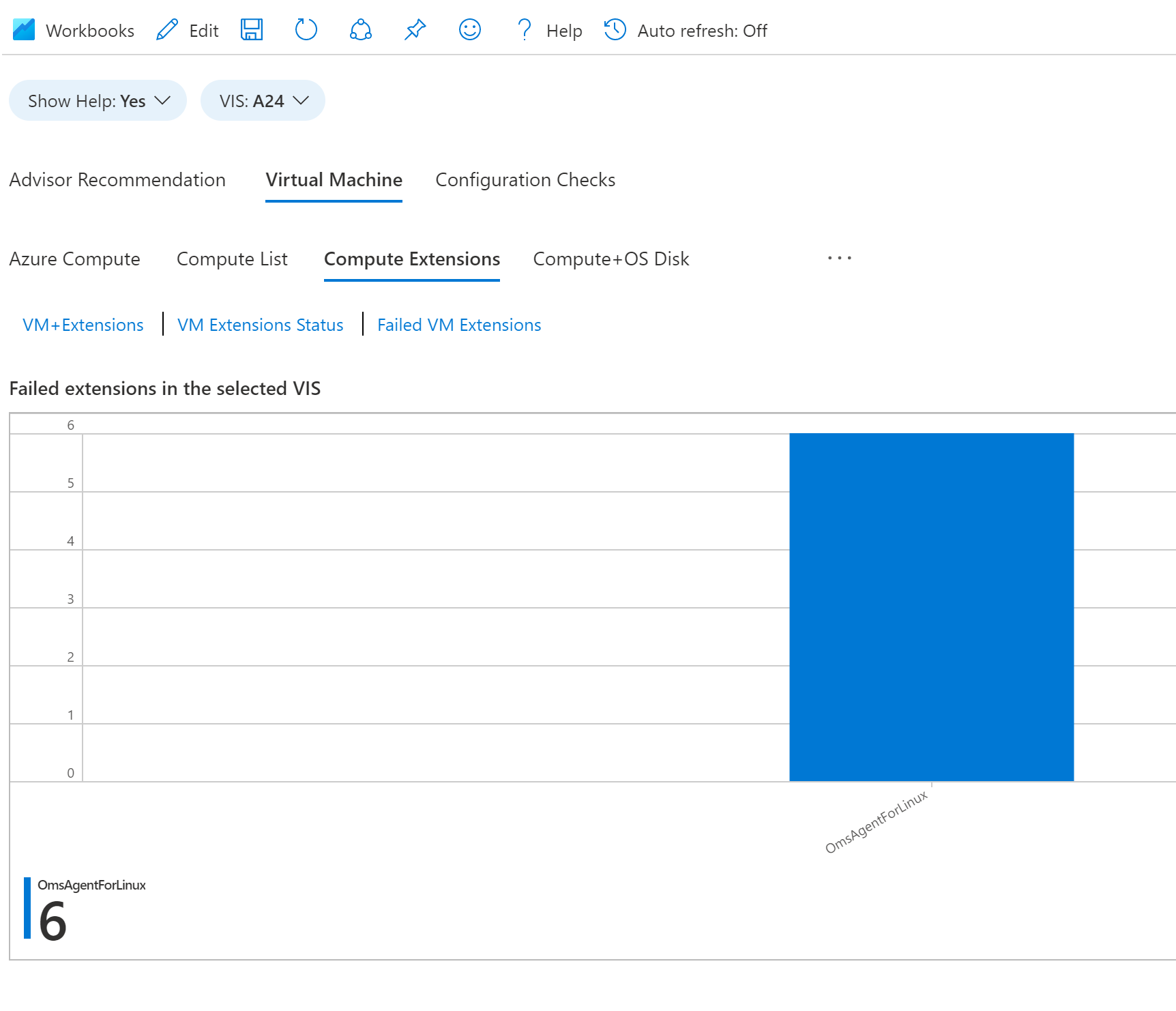 “失败的 VM 扩展”显示所选 VIS 中哪些 VM 扩展失败。