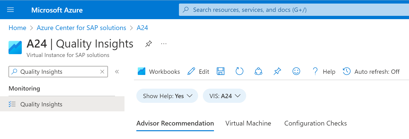 Azure SAP 解决方案中心中的质量见解 Azure 工作簿通过在 VIS 上运行 100 多项质量检查,提供有关 SAP 系统资源的见解。 该功能是内置于 SAP 解决方案虚拟实例 (VIS) 的监视功能的一部分。 这些质量检查可确保 SAP 系统使用 Azure 和 SAP 最佳做法来提高可靠性和性能。