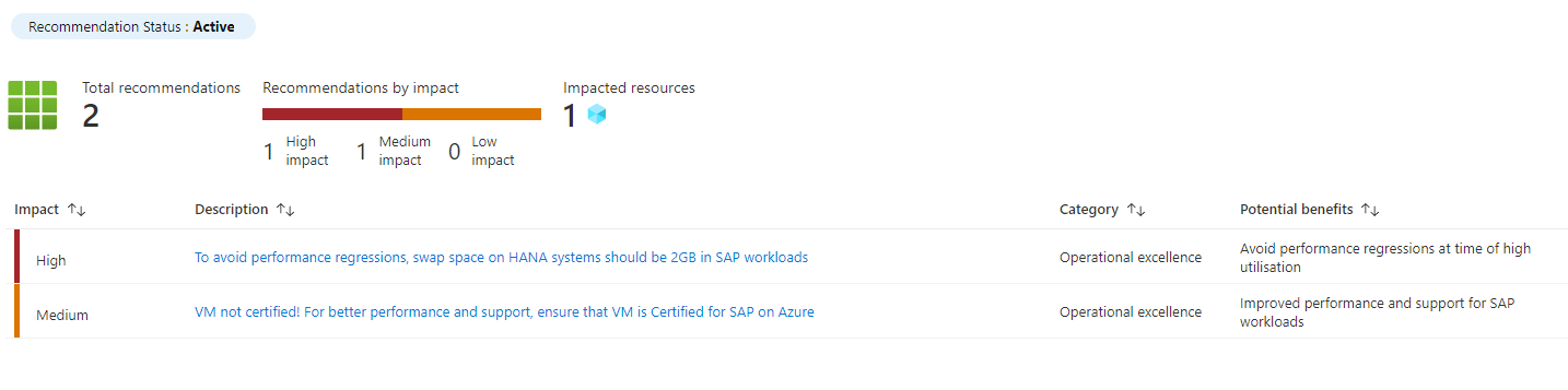 这些质量检查以 1 小时 1 次的常规频率在所有 VIS 实例上运行。 Azure 顾问中的相应建议也会以相同的 1 小时频率刷新。如果对 Azure SAP 解决方案中心中的一个或多个建议采取措施,请等待下一次刷新,查看来自 Azure 顾问的任何新建议。