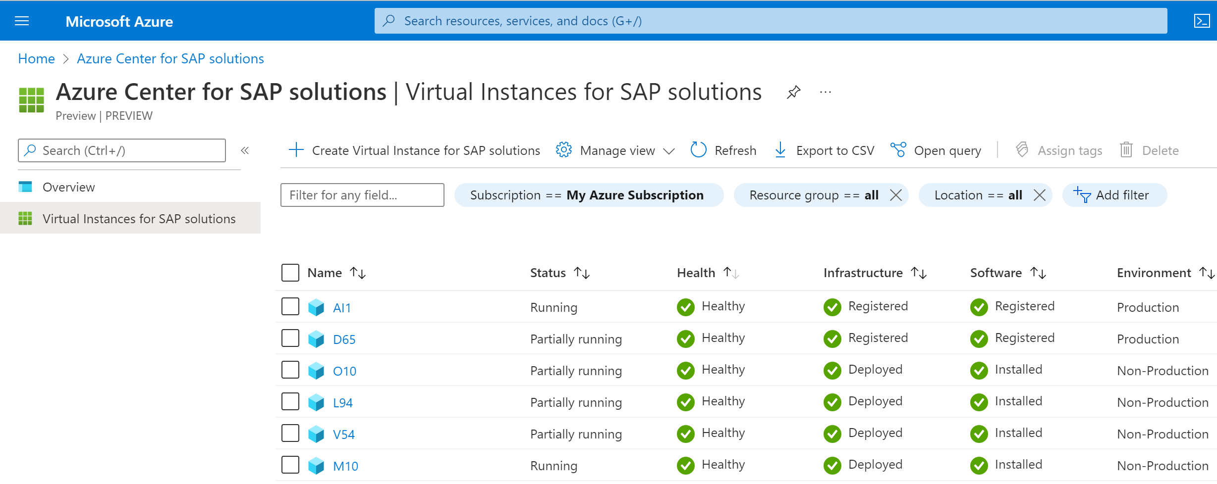 在“Azure SAP 解决方案中心”页面的边栏菜单上,选择“SAP 解决方案虚拟实例”。