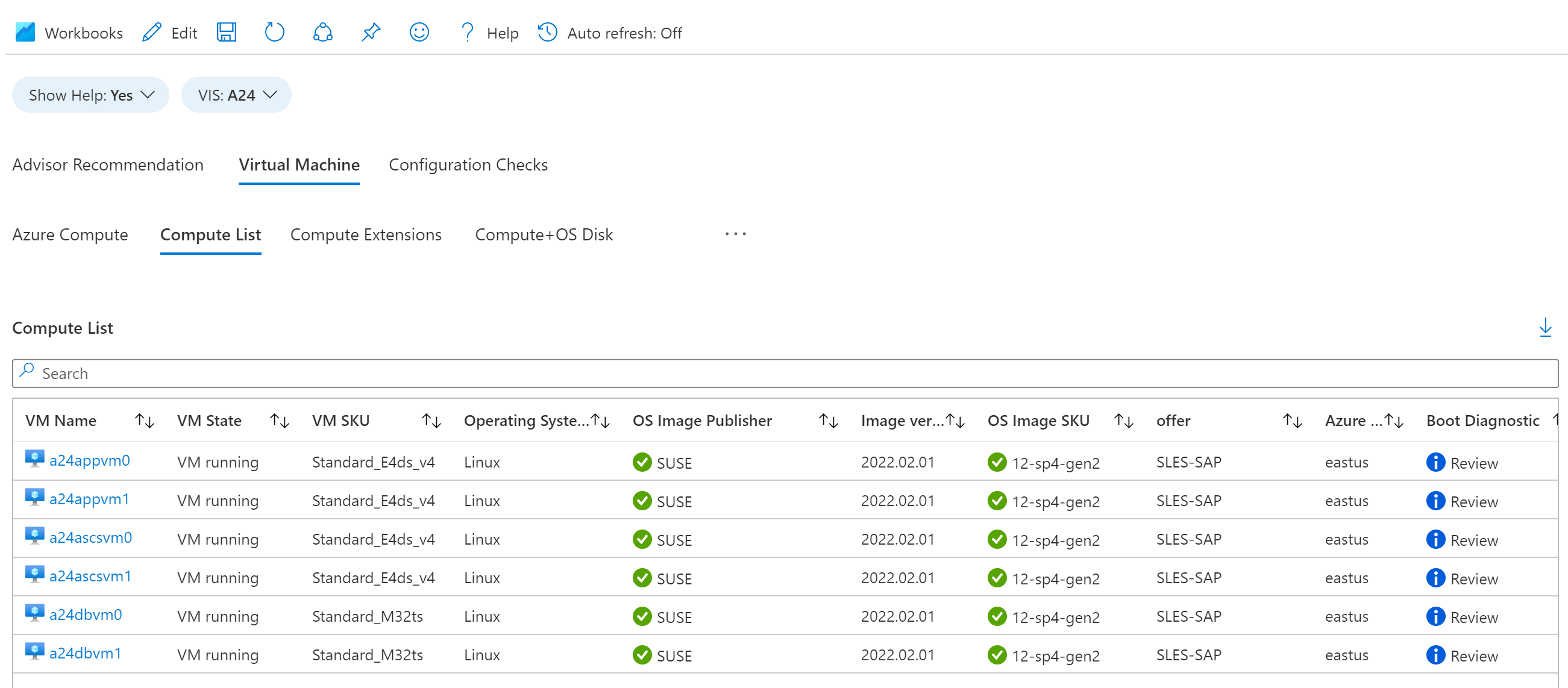 “计算列表”选项卡显示有关 VIS 中 VM 的信息表。 此信息包括 VM 的名称和状态、SKU、OS、发布者、映像版本和 SKU、产品/服务、Azure 区域、资源组、标记等。