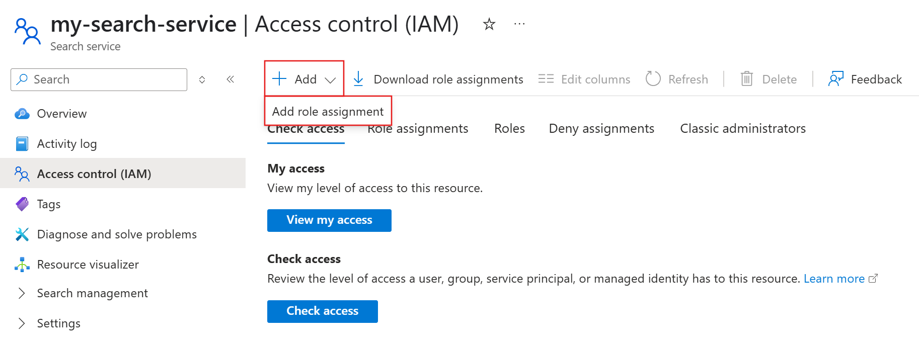 将 搜索服务参与者 角色分配给用户帐户或托管标识。