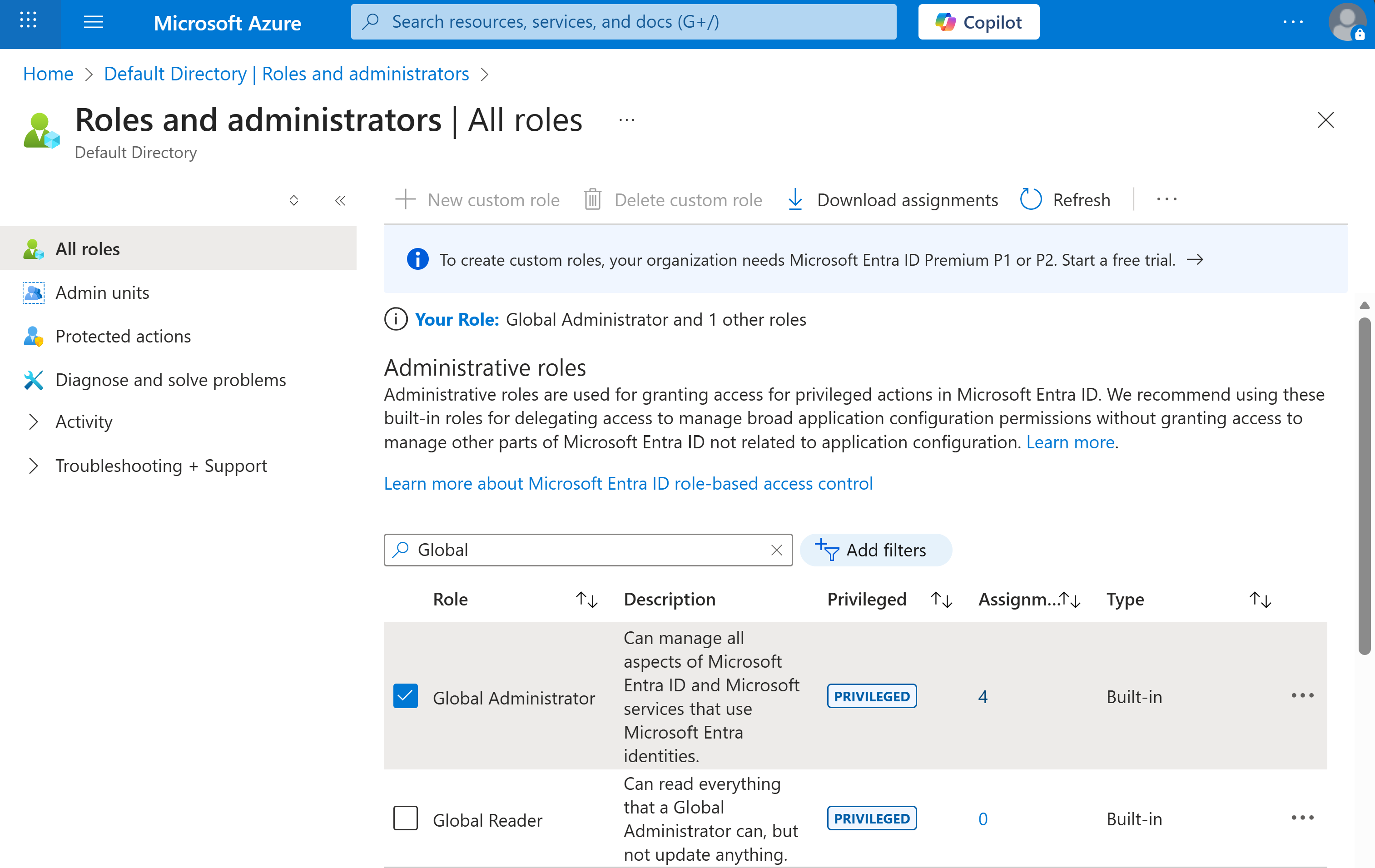 搜索 全局管理员 或 特权角色管理员 角色,并选择它。