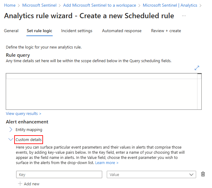 在“设置规则逻辑”选项卡上,展开“自定义详细信息”部分,例如: