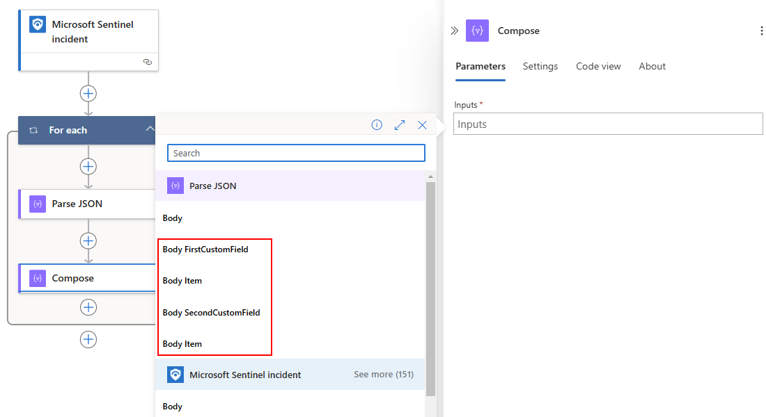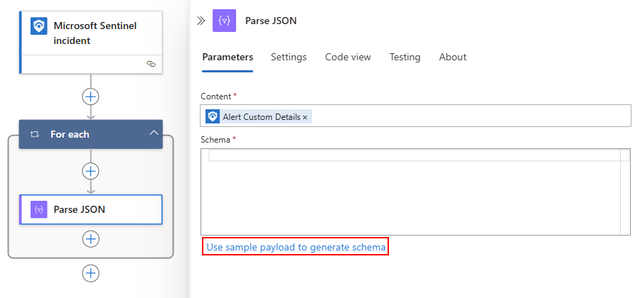 此选择会自动围绕“分析 JSON”添加一个“For each”循环,因为一个事件包含一个警报数组。