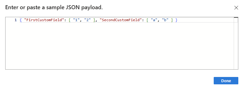 在“输入或粘贴示例 JSON 有效负载”框中,提供示例有效负载,然后选择“完成”。
