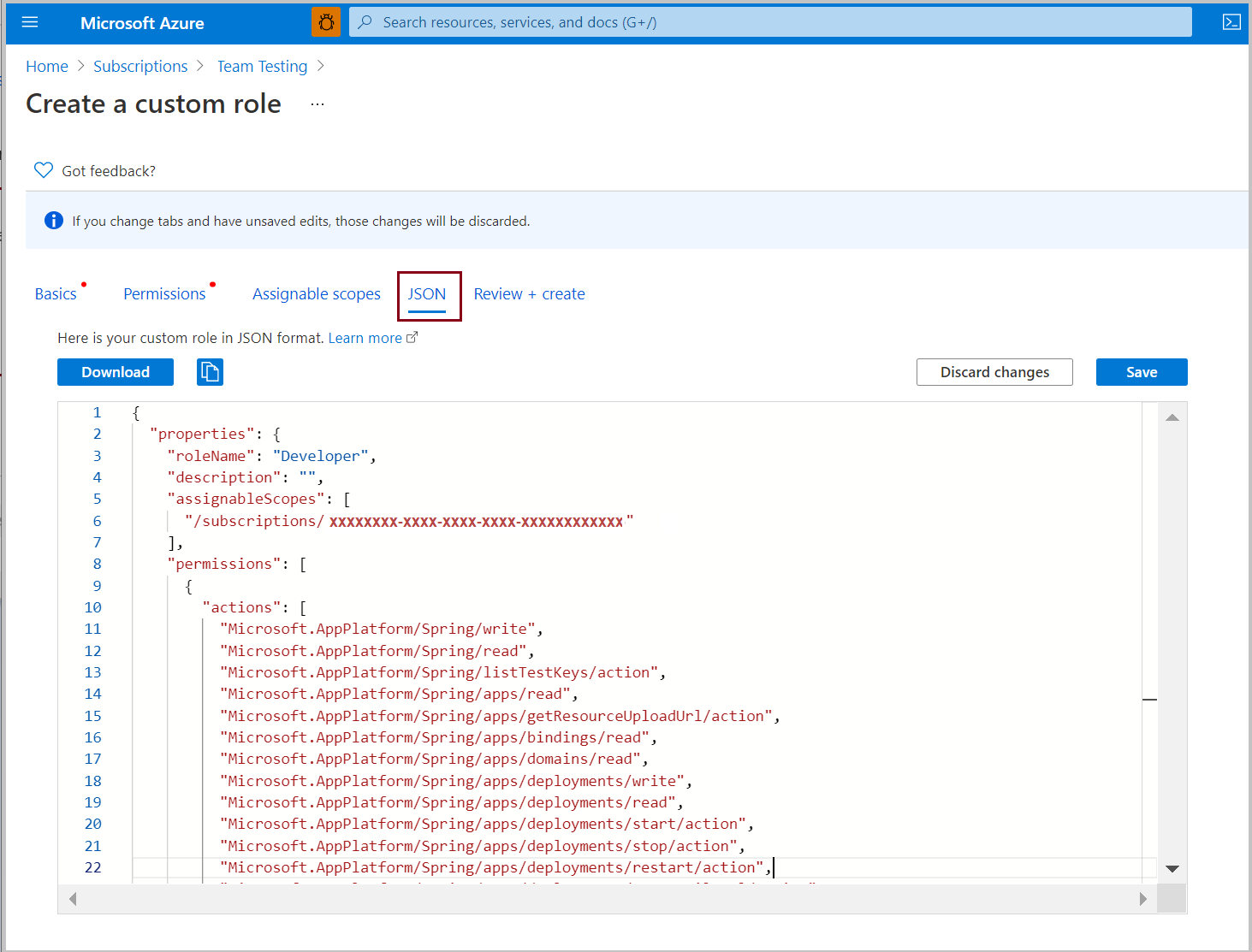 本文介绍如何创建将权限委托给 Azure Spring Apps 资源的自定义角色。 自定义角色通过各种默认权限对 Azure 内置角色进行扩展。