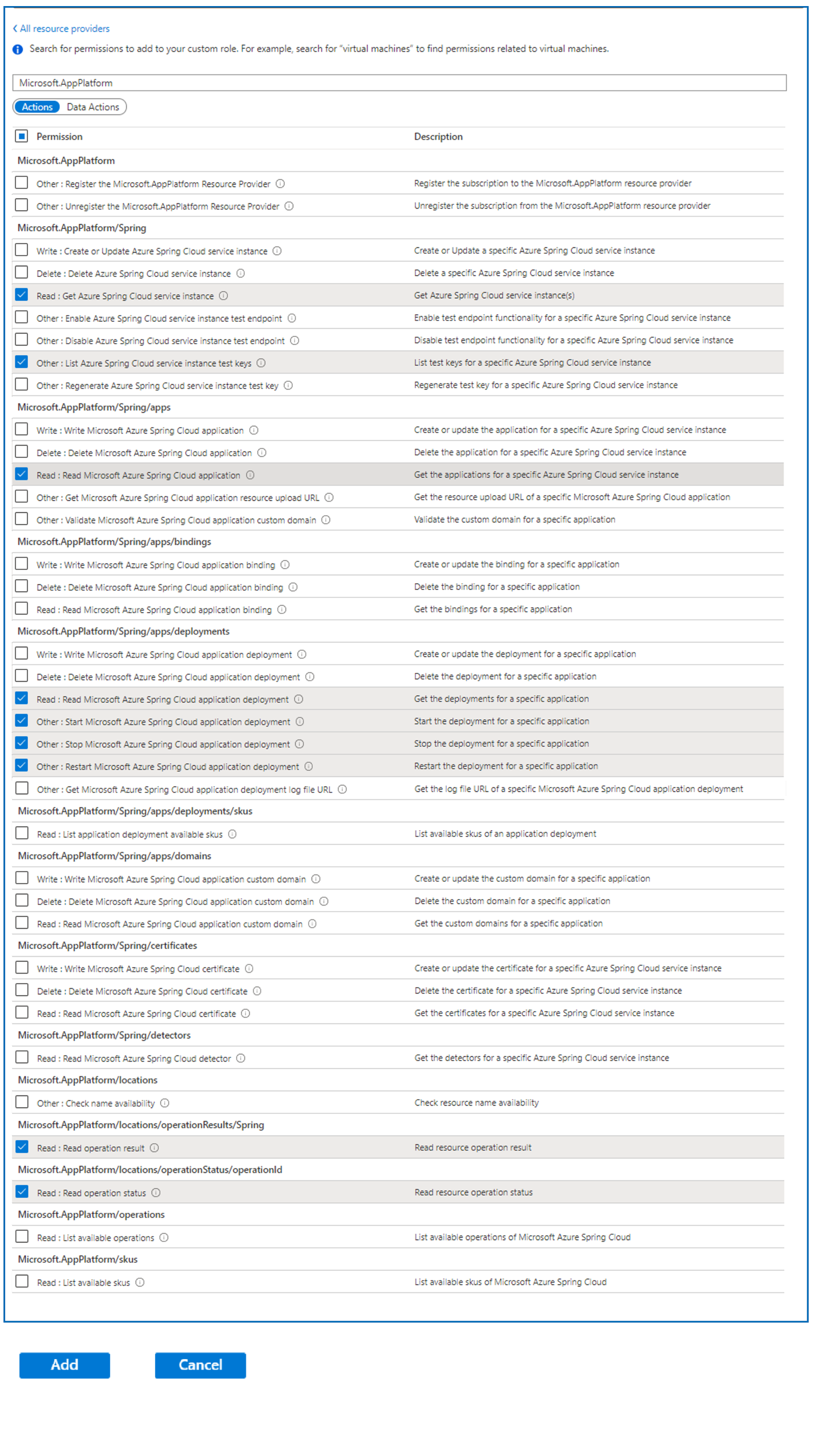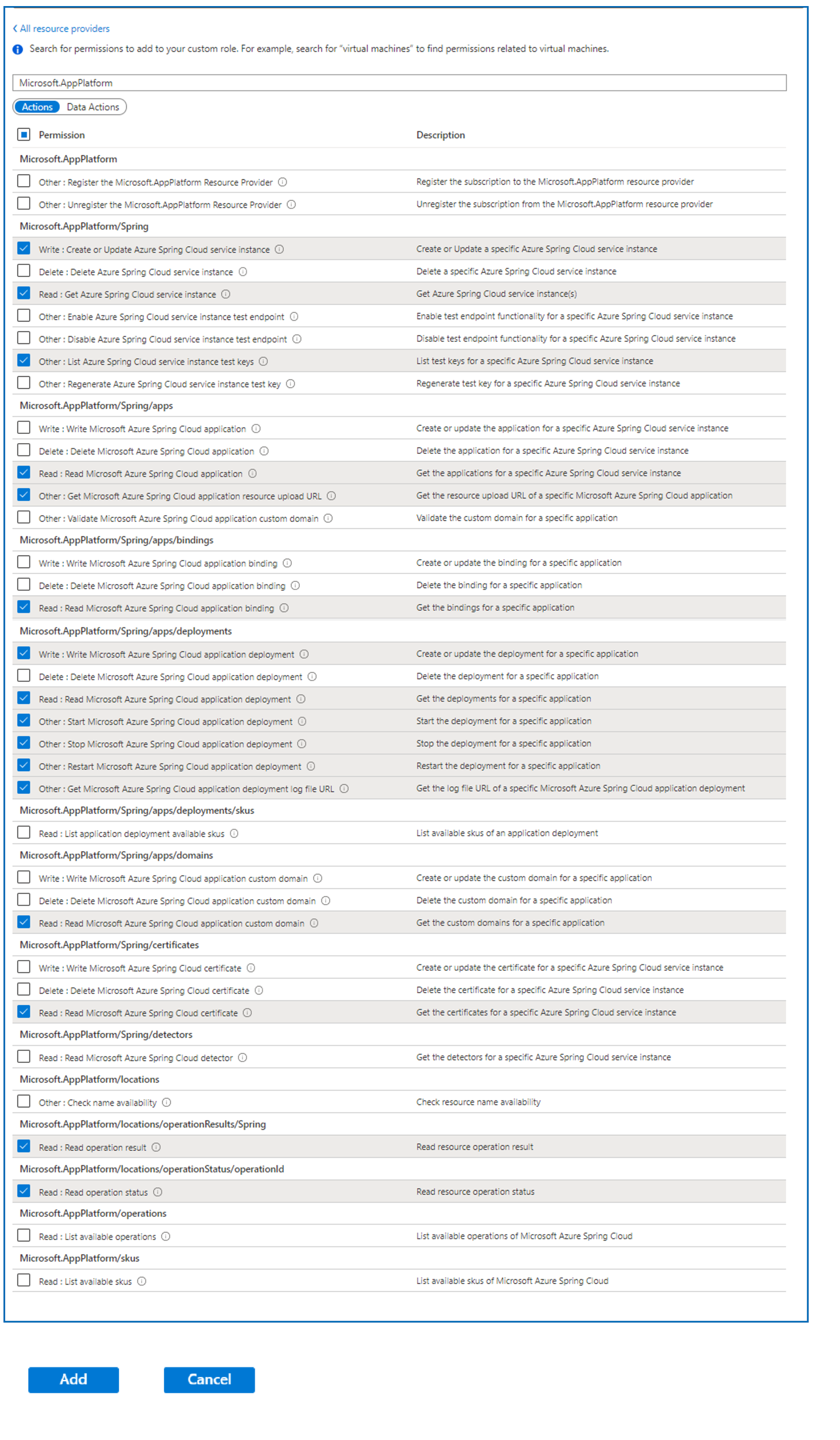 在“Microsoft.AppPlatform/locations”下,选择: