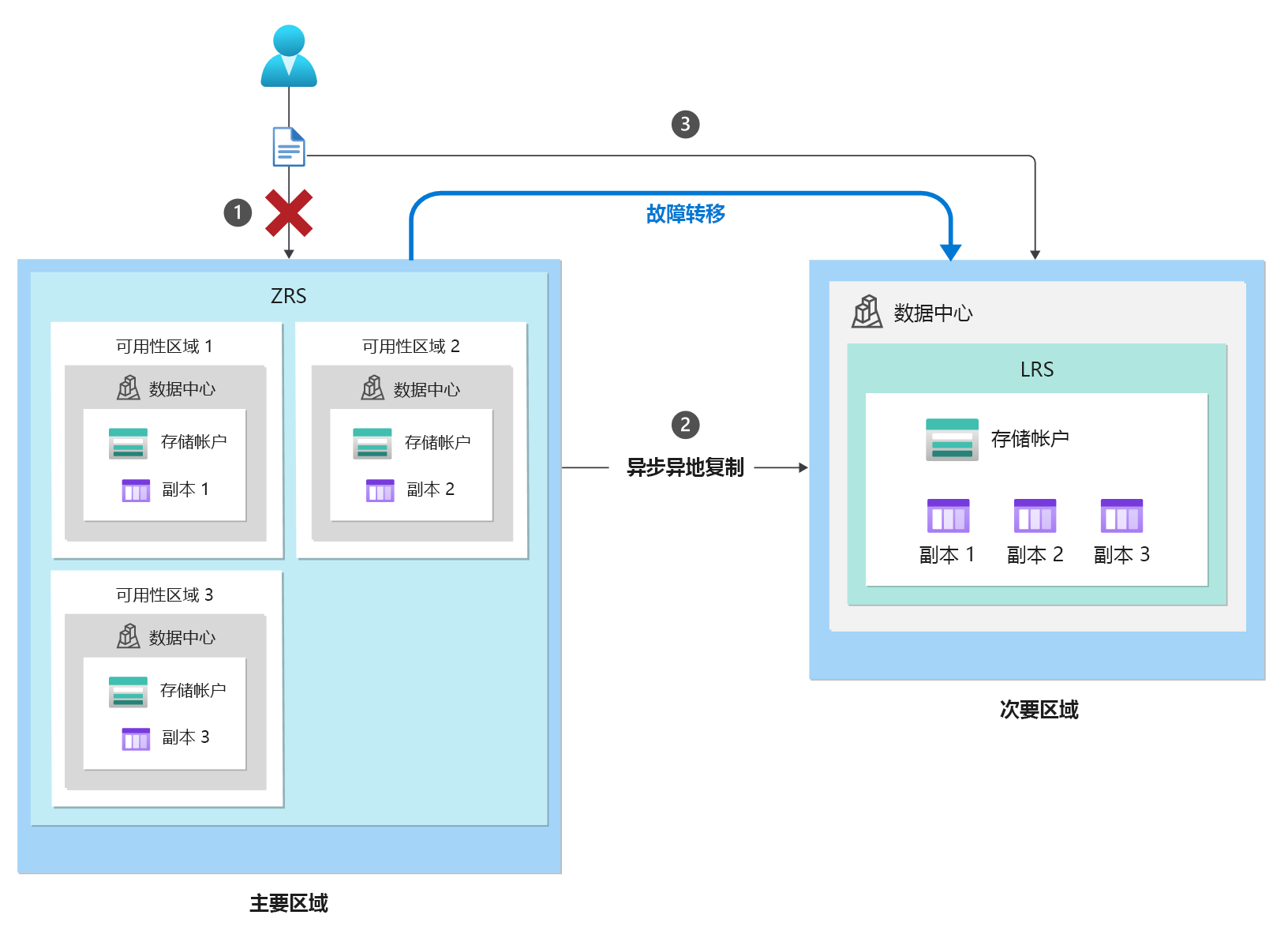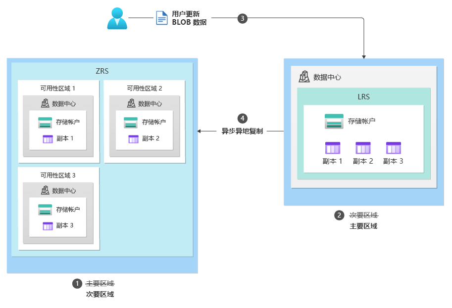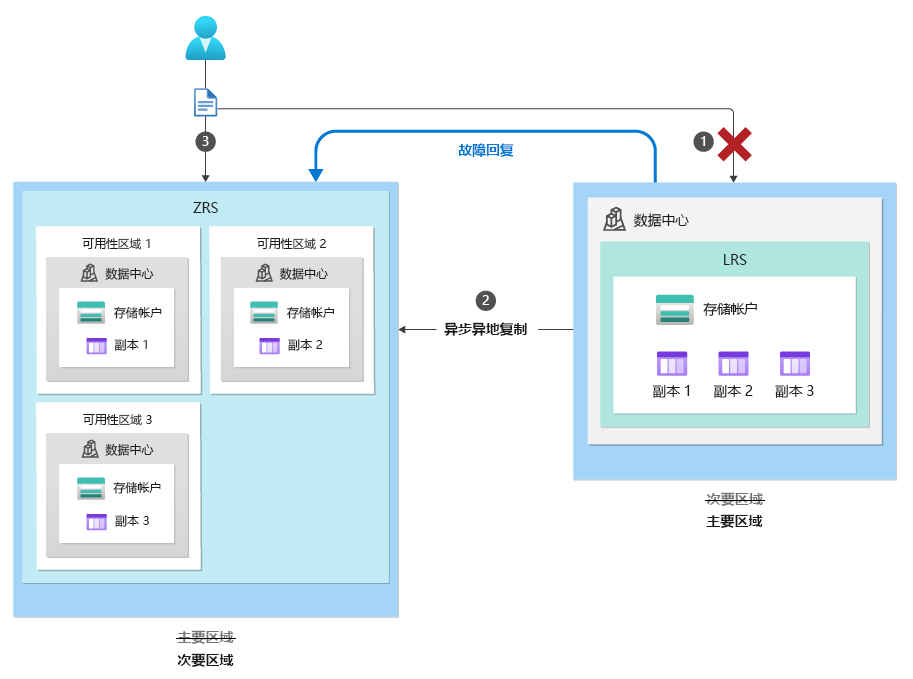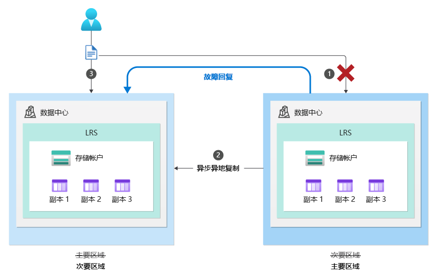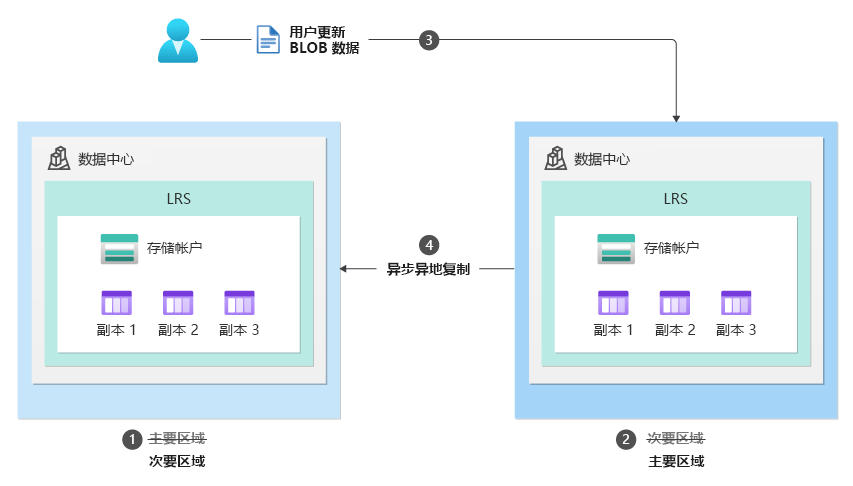 在计划内故障转移过程中,主要区域的存储服务终结点将会变为只读,而剩余的更新完成复制到次要区域。 接下来,将切换所有存储服务终结点的域名服务 (DNS) 条目。 存储帐户的辅助终结点将成为新的主终结点,原始主终结点将会成为新的辅助终结点。 尽管切换了主要区域和次要区域,但每个区域中的数据复制将保持不变。