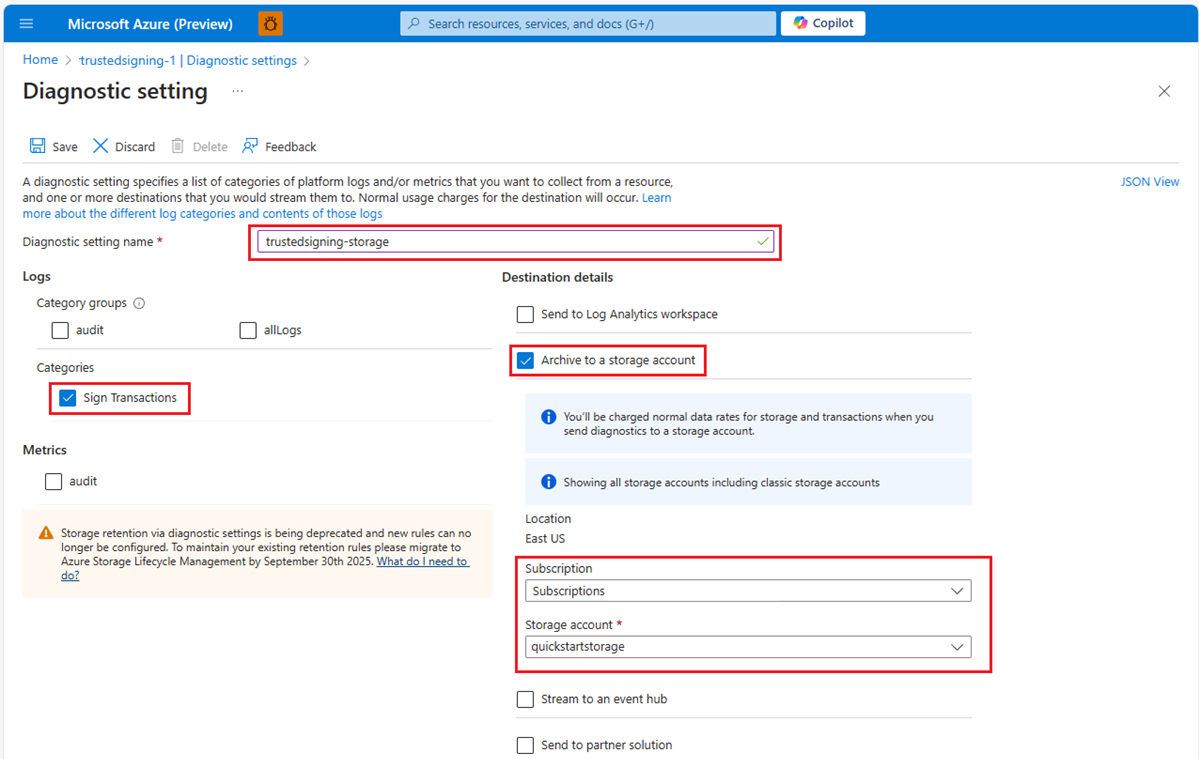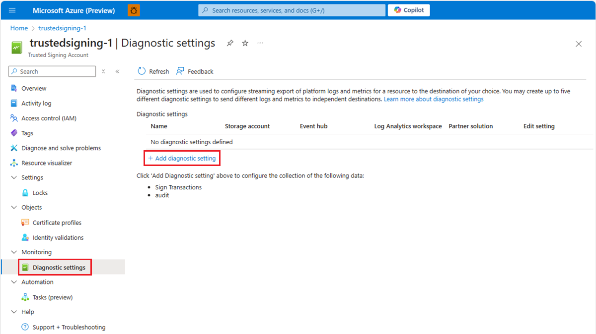 可以使用诊断设置将受信任签名帐户平台指标、资源日志和活动日志路由到各种目标。 对于使用的每个 Azure 资源,必须配置单独的诊断设置。 同样,每个受信任签名帐户都应该配置相应的设置。