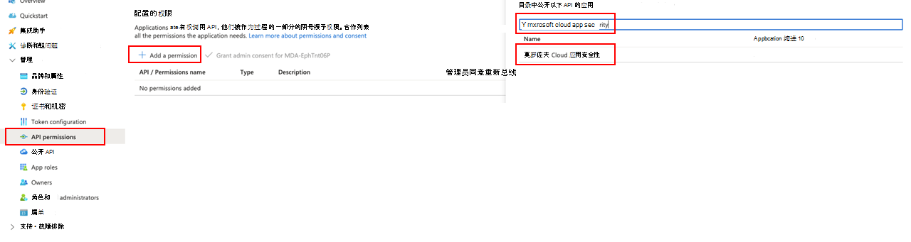 若要使应用能够访问Defender for Cloud Apps并为其分配“读取所有警报”权限,请在应用程序页上选择“API 权限>”“添加组织使用>的权限> API”,键入Microsoft云应用安全,然后选择“Microsoft云应用安全”。