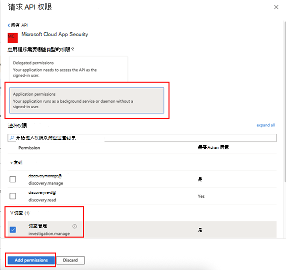 需要选择相关权限。 Investigation.Read 只是一个示例。 有关其他权限范围,请参阅 支持的权限范围