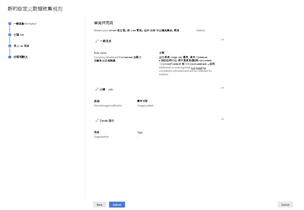 在 “查看并完成 ”部分中,查看规则设置,然后选择“ 提交”。