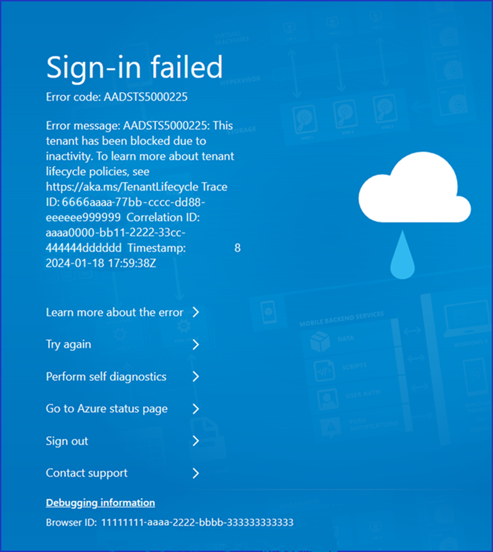 对于租户因非活动而不可访问,预计会出现错误消息 Error message: AADSTS5000225: This tenant has been blocked due to inactivity. To learn more about ...。