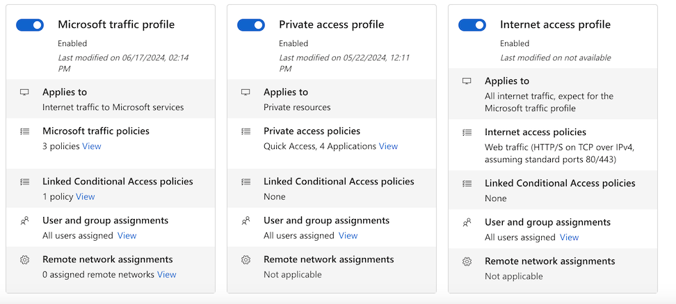 如果在链接的条件访问策略部分看到“无”,则表示没有链接到流量转发配置文件的条件访问策略。 若要创建条件访问策略,请参阅通过全球安全访问的通用条件访问。