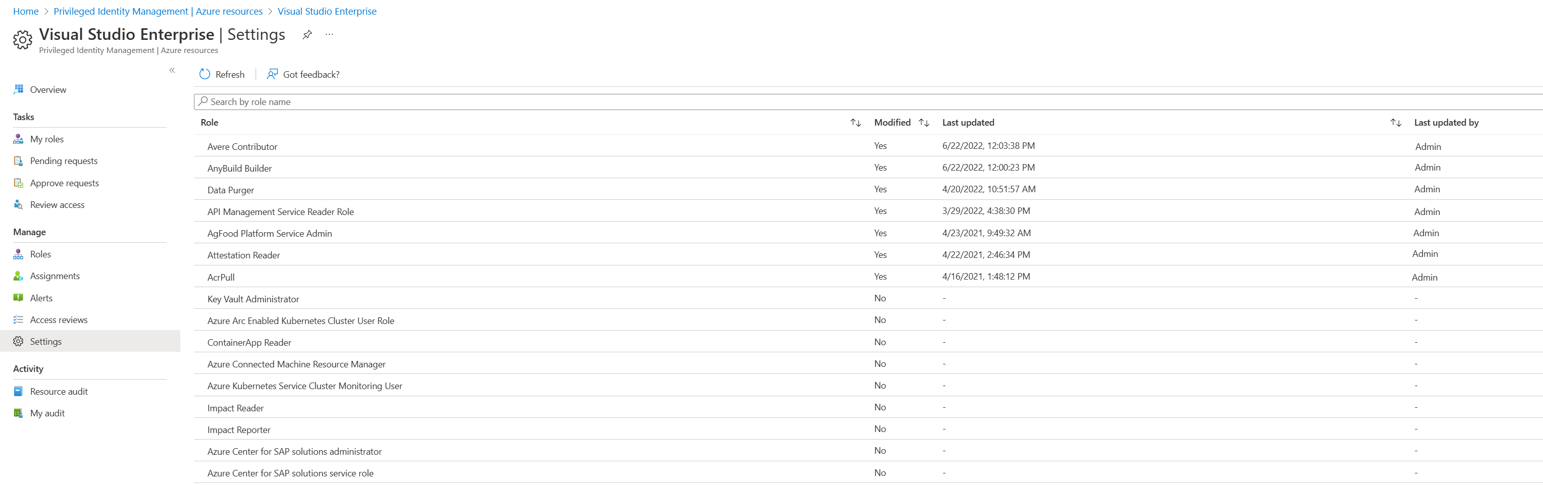 选择“设置”。 查看所选资源的 PIM 策略列表。