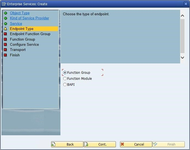- 在“终结点类型”屏幕上,选择“函数组”,然后按“继续”。 必须选择函数组,因为 MIM 的 Web 服务配置工具需要所有选定 BAPI 的单个 URL。