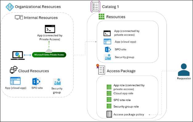 与云应用、支持预配或联合身份验证或安全组的本地应用类似,通过 Microsoft Entra Private Access 为连接配置的应用可以集成到权利管理中,从而允许组织跨多种类型的资源保持一致的治理过程。