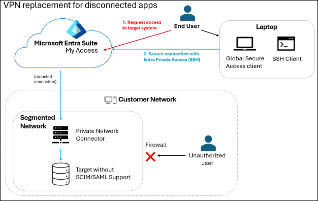 传统上,Entra 应用程序代理用于提供对本地基于 Web 的应用程序的安全远程访问,而无需 VPN。 远程工作的用户可能仍需要访问传统上需要 VPN 作为协议(如 MSSQL、SSH 或 RDP)的非基于 Web 的应用。 这提供了两个关键问题: