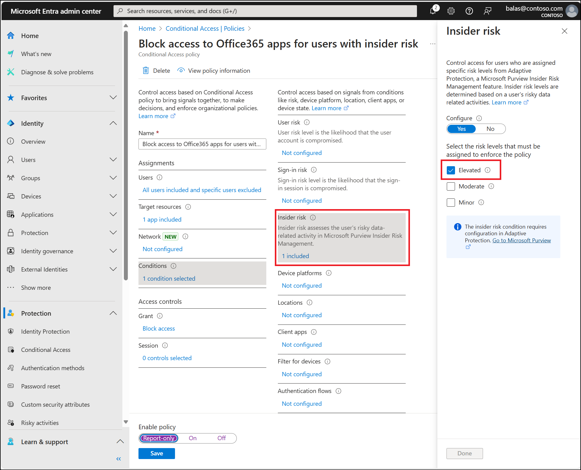 - 在 “条件>内部风险”下,将 “配置”设置为 “是”。