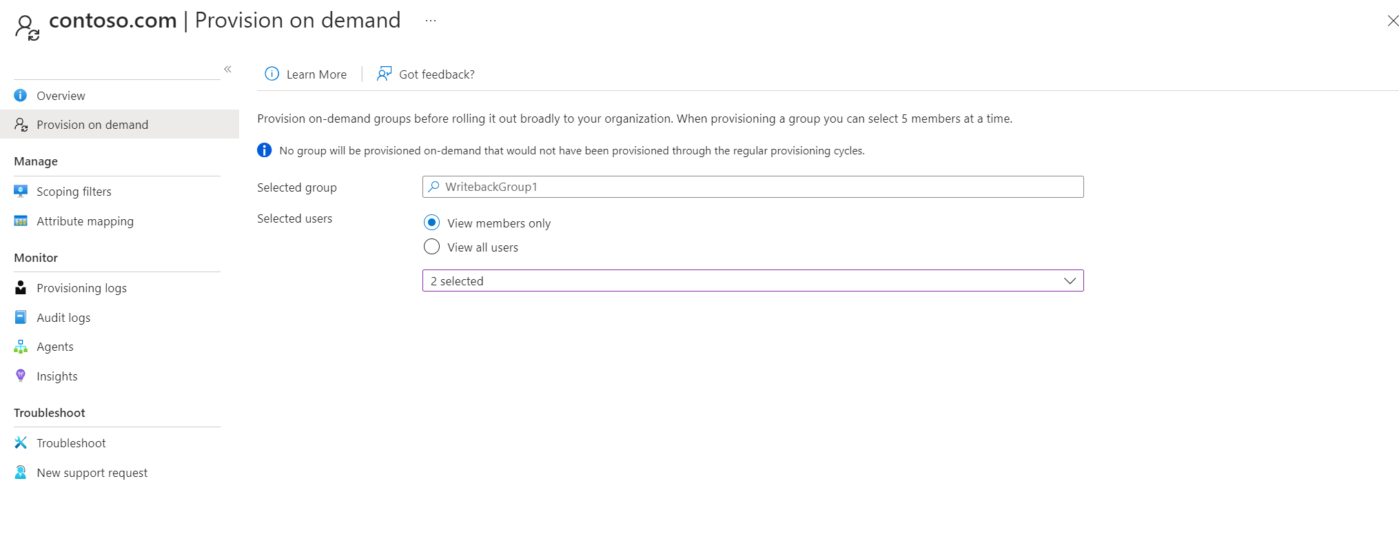 使用按需预配时,不会自动预配成员。 您需要选择您希望测试的成员,并且最多可以选择五名成员。