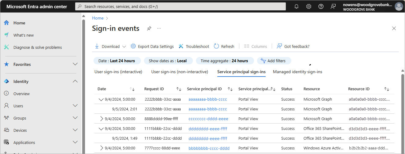 为了便于理解服务主体登录日志中的数据,服务主体登录事件进行了分组。 相同条件下同一实体的登录将聚合到单个行中。 可以展开该行来查看所有不同的登录及其不同的时间戳。 当以下数据匹配时,会在服务主体报告中对登录进行聚合: