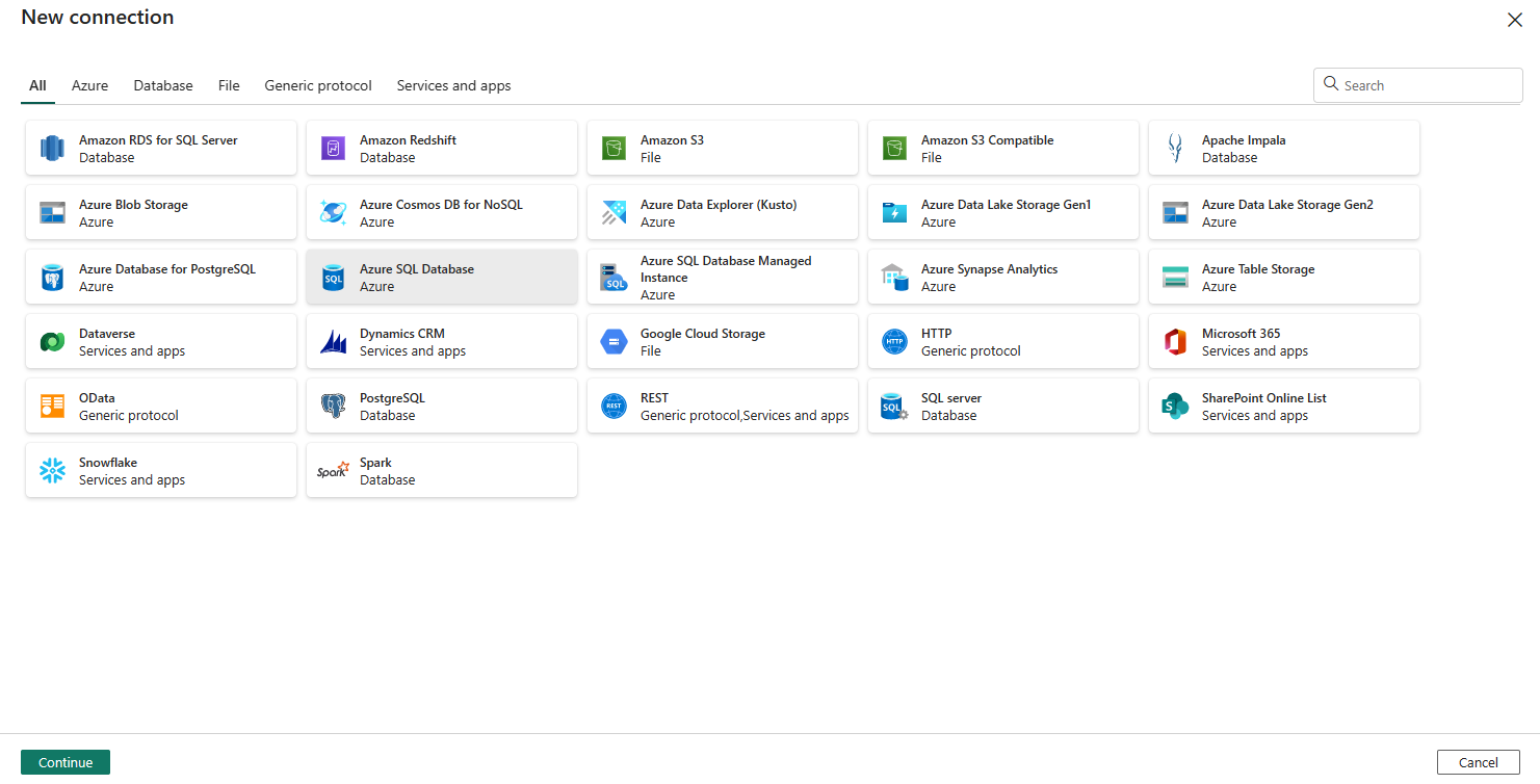 从弹出窗口中选择数据源类型。 你将使用 Azure SQL Database 作为示例。 选择“Azure SQL 数据库”,然后选择“继续” 。