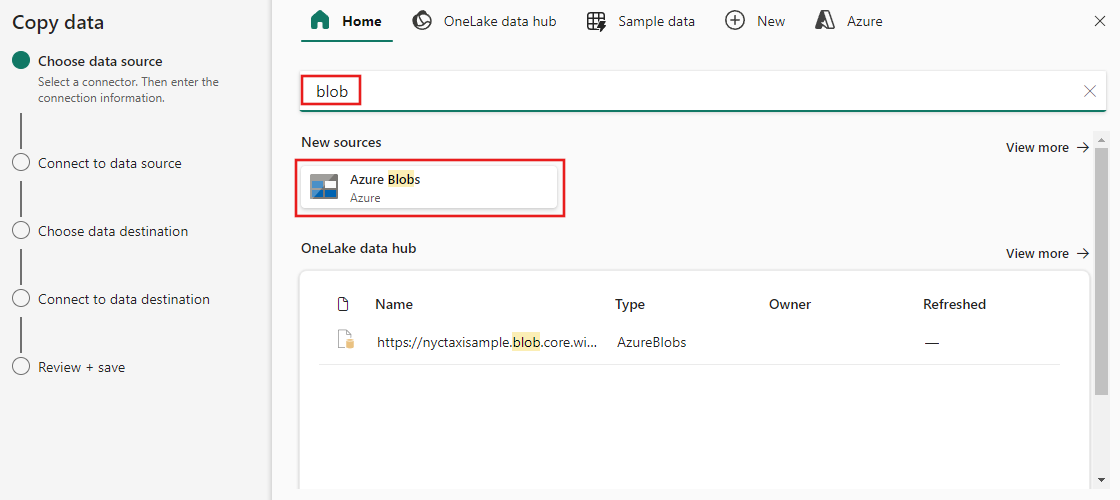 从类别中选择数据源类型。 你将使用 Azure Blob 存储作为示例。 选择“Azure Blob 存储”。