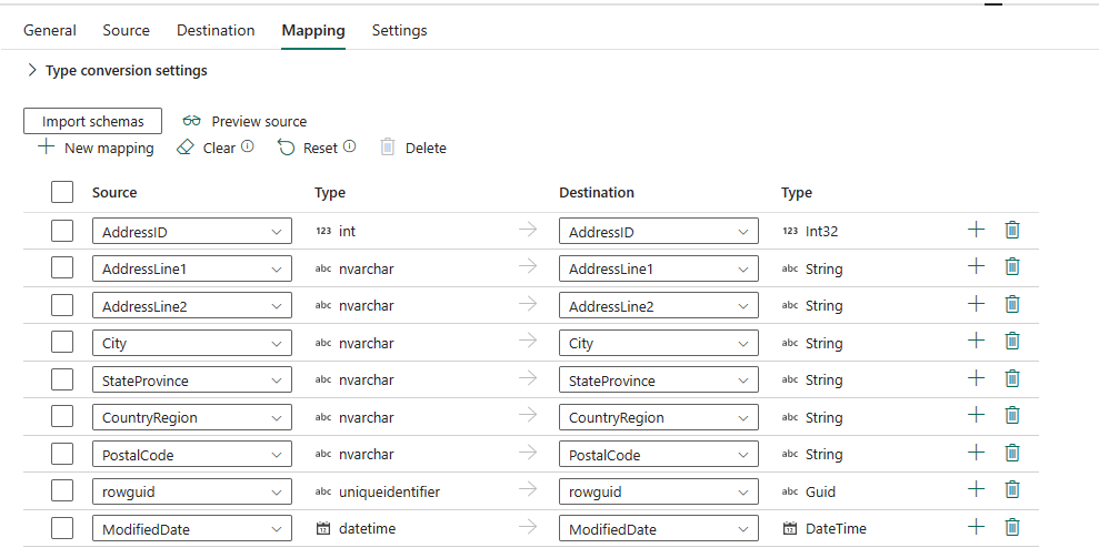可以看到自动映射显示。 指定 源 列和 目标 列。 如果在目标中创建新表,则可以在此处自定义 目标 列名称。 如果要将数据写入现有目标表,则无法修改现有 目标 列名称。 还可以查看源列和目标列的 类型。