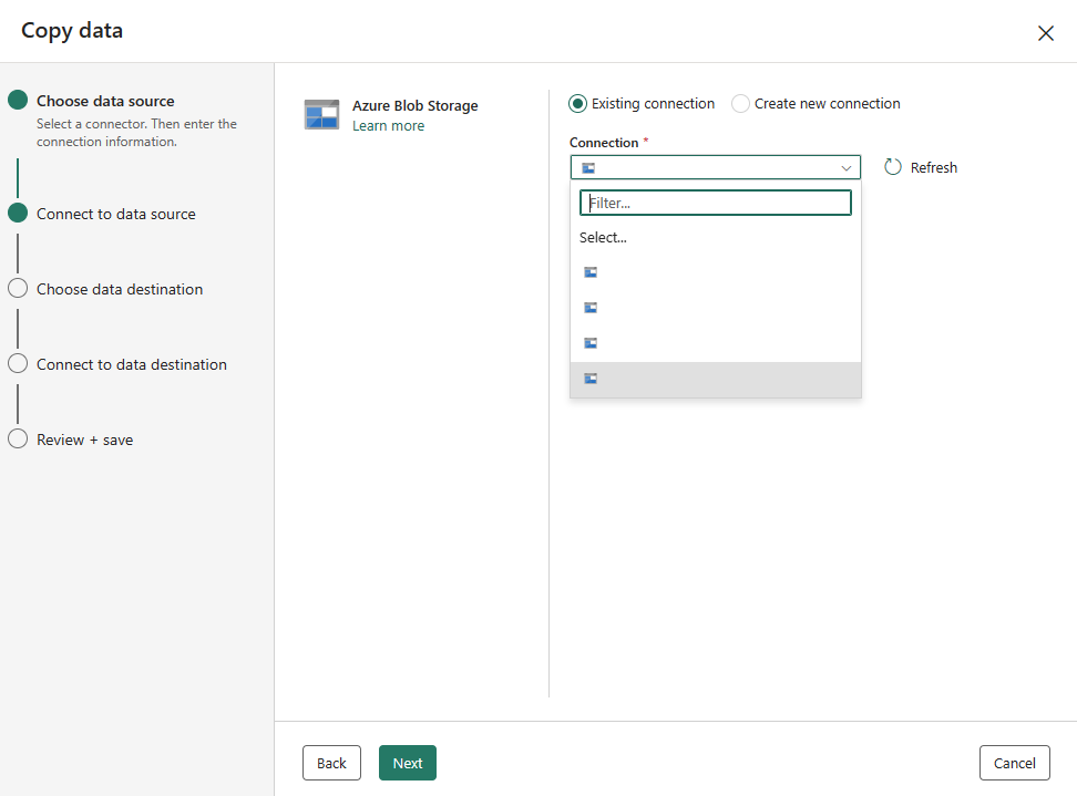 在 “连接”中,选择现有连接,或选择“ 更多 ”以创建新连接。