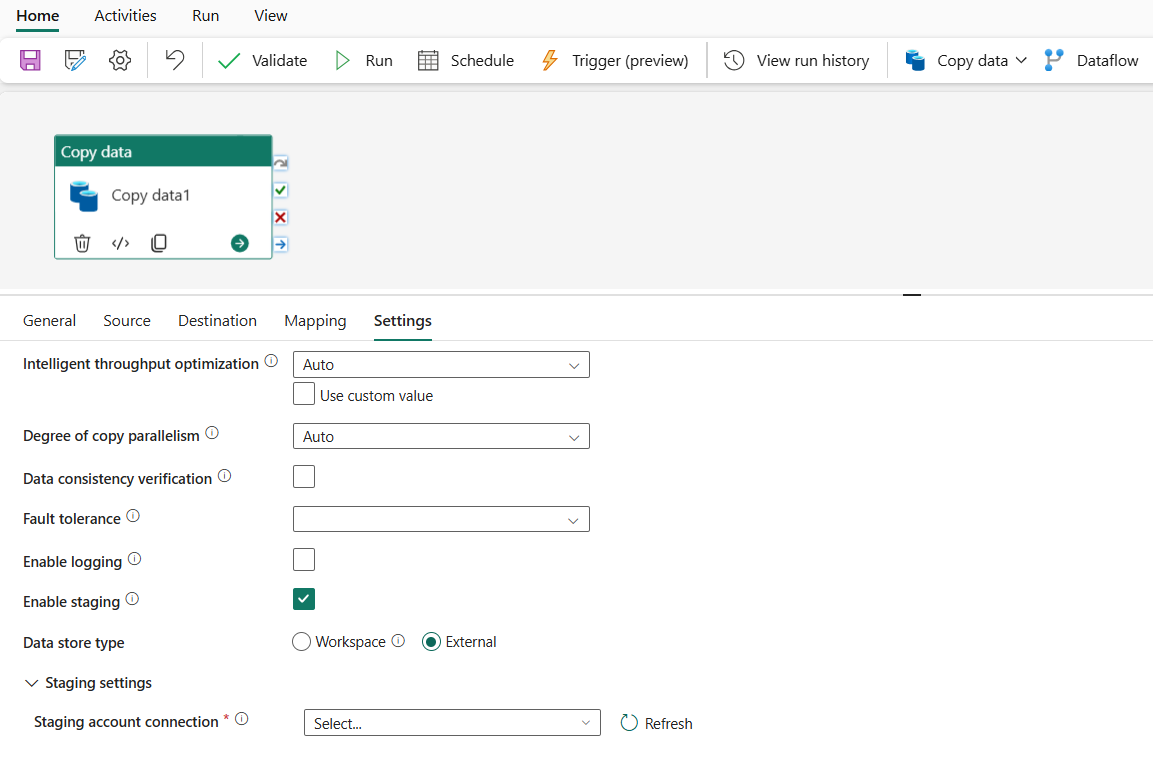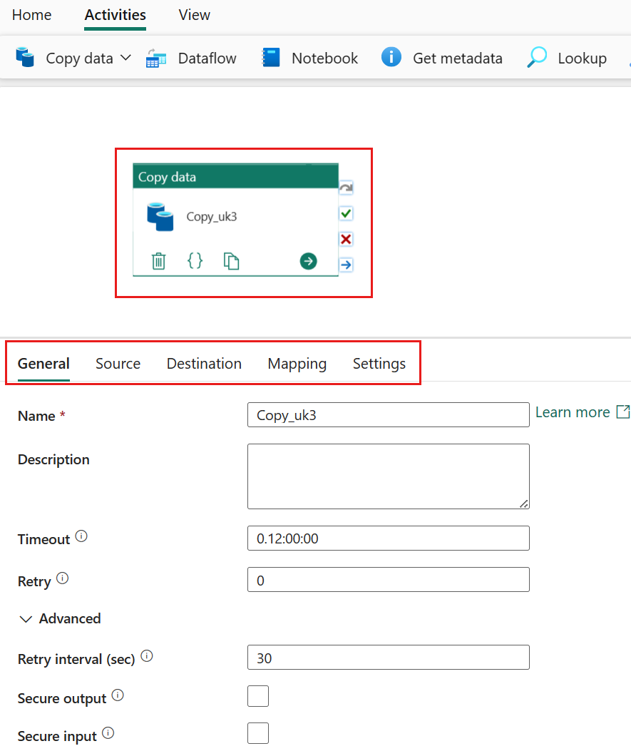 完成后,复制活动就将被添加到您的管道画布中。 选中后,所有设置(包括此复制活动的高级设置)都将位于选项卡下。